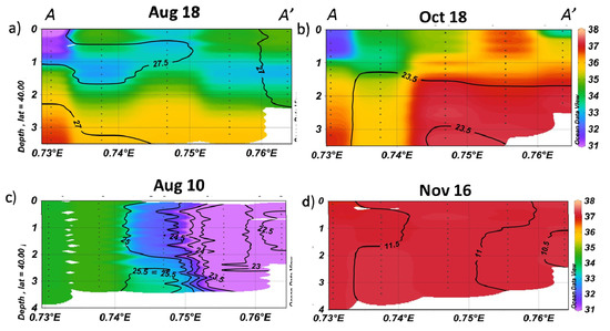 Vertical transect of (a) stratification summer situation, (b) stratification autumn situation, (c) situation during episode E1, (d) situation during episode E4. The color bar shows salinity values; black lines show temperature values.