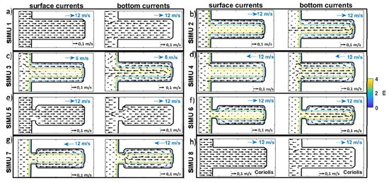 Representation of the simulations: (a) SIMU 1, surface and bottom; (b) SIMU 2, surface and bottom; (c) SIMU 3, surface and bottom; (d) SIMU 4, surface and bottom; (e) SIMU 5, surface and bottom; (f) SIMU 6, surface and bottom; (g) SIMU 7, surface and bottom; (h) SIMU 8, surface and bottom. Blue arrows show the wind direction with the intensity wind and black arrows show the water current intensity.