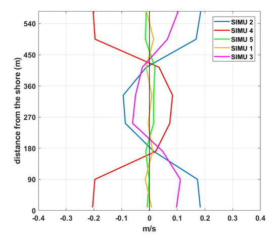 The water renewal has a relevant influence on water quality within the bay. A simple assessment of the residence time may be computed dividing the volume of water by the flow rate that comes out of the bay (calculated from the velocities in Figure 12). In these cases, we obtain residence times of 4 d for SIMU 2 and 4, and 1 day for SIMU 1 and 5 and respectively. The rest of the simulations are in the same order of magnitude. From the observed change flow (Figure 8 and Figure 9) the average residence time is estimated in 4 d. The study carried out by F-Pedrera Balsells et al. [42] compute the residence times in the bay in more detail and some possible modifications to help in the bay management.