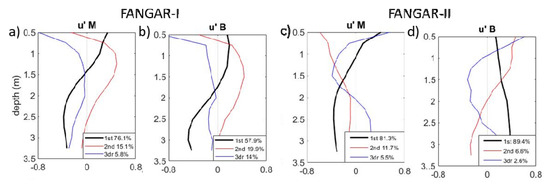 Empirical orthogonal functions (EOF) analysis for low-frequency filtered data during FANGAR-I (a,b) and FANGAR-II (c,d) along-shore currents. The legend shows the corresponding percentage of the explained variability.