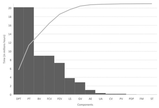The mean time between failures plays a major role in the reliability investigations. It has a significant contribution to the maintenance scheduling and cost prediction. Figure 3 shows the mean time between failures of each component in the unloading system. Clearly, the differential pressure transmitter and the pressure transmitter have the longest time intervals without failures. This is of no surprise to the industry practitioners due to the nature of the instrumentation operation and material of construction. On the other hand, the positive displacement pump and the positive displacement flow meter have the shortest time intervals between consecutive failures due to the design complexity of the rotating mechanisms within the two components. Most importantly, any failure of the flow meter needs to be detected as early as possible to avoid uncertainty variation in fluid measurements. In addition, the strainer has a short period between consecutive failures because usually, such filtration systems need a continuous cleaning of its internal parts and the failures of these components can be observed without a regular frequent cleaning. Therefore, the frequent cleaning of the strainer will lead to an increase in the mean time between the failures. It is noted that all the valves have a medium time between failures, while piping spools have long time intervals between failures. According to some studies discussed earlier in the literature review section, the air eliminator has a relatively low mean time between failures due to the complex design in the separation process that takes place in this portion of the system. In addition, the unloading arms also have a relatively low mean time between failures compared to the piping spools due to the dynamic nature of the swivel joints that connects the arm parts together and the excessive movement they experience externally.