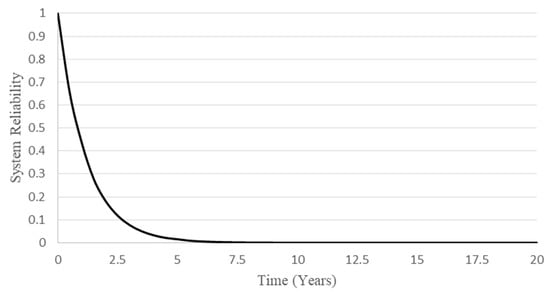 Since the components and the whole system are assumed to have constant failure rates (random failures), the reliability figures must be investigated in multiple time intervals. For each component, the reliability of the system is calculated at the end of the first year, the fifth year, the tenth year, and the twentieth year using Equation (3). Table 5 shows the reliability of each component in the system.