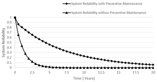 Figure 5 shows the improvements reflected on the system reliability due to conducting preventive maintenance. It is clear that the preventive maintenance has a large impact on the total system reliability improvement.