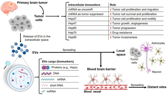 Remarkable achievements in the molecular and genetic fields have opened new frontiers in the management of brain tumors, including the identification of new diagnostic and prognostic molecular biomarkers released by the tumor. Noteworthy examples of these biomarkers are carried by extracellular vesicles (EVs), released by tumors. EVs, which are considered mediators of intercellular communication, carry bioactive molecules between cells close by or distant, affecting physiological and pathological processes in recipient cells [3,4,5,6,7,8,9]. MicroRNAs (miRNAs) and molecular chaperones are among the bioactive molecules carried by EVs that affect, either directly or indirectly, cancer initiation, cell proliferation and growth, and metastasization [10,11,12,13,14]. Consequently, specific miRNAs and molecular chaperones have been suggested as targets for analysis that can provide useful information for differential diagnosis, assessing prognosis and response to treatment, and for developing novel therapies [15]. One added advantage is that EVs can be obtained from biological fluids with minimally invasive procedures.