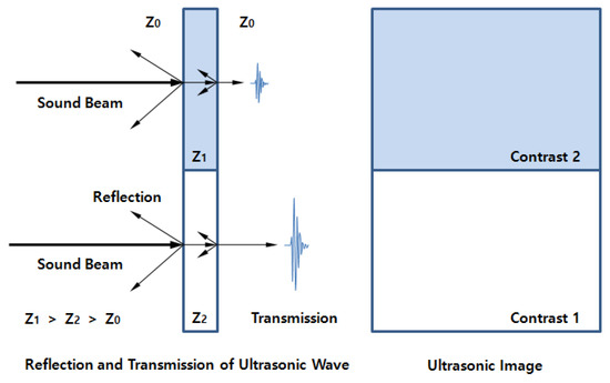 where is the reflection coefficient at the interface for propagation in two media, is the transmission coefficient at the interface, and Z is the acoustic impedance, which is expressed as the product of the density and the speed of sound in the material.