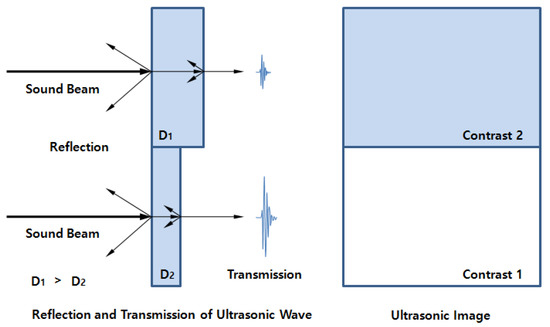 In the TTU method, ultrasound is generated by one sensor and received by the other sensor while water is injected through the squirters on both sides, as shown in Figure 1; the water is used as a couplant and it must be continuously injected. The sound pressure of the received ultrasound varies, depending on the acoustic impedance or attenuation/scattering. The defects are detected by scanning the area that is to be inspected and representing the sound pressure change of the scanned area on a two-dimensional (2D) plane. The sound pressure at the receiver varies, depending on the acoustic impedance, attenuation, and scattering. The acoustic impedance results in a change in the sound pressure of ultrasound, which is reflected or transmitted at an interface, because it propagates from one medium to another or to a defect. The reflection and transmission coefficients of ultrasound at an interface are determined by Equations (1) and (2) at normal incidence.