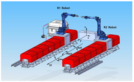 We addressed the problem of misinterpreting an intact part for a defect when the sound pressure changes due to the misalignment of the two sensors, which is caused by the deformation of the mechanism. Consequently, an algorithm was developed that is capable of measuring the degree of deformation by a stepwise procedure that involves using a 3D laser measuring instrument, calculating the correction values based on the measurements, and compensating for the axis misalignment. This algorithm first follows a motion along the bogie axis (yy-axis) after setting the coordinate system, as shown in Figure 5; it also measures the coordinate values of the x-, y-, and z-coordinates at the robot control point position to correct the coordinate misalignment of coordinates due to the deformation of the mechanism. In this instance, it is assumed that the control of the traveling multi-joint robot is accurate and that deformation occurs only in the bogie that moves the robot.
