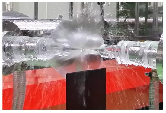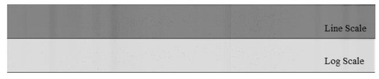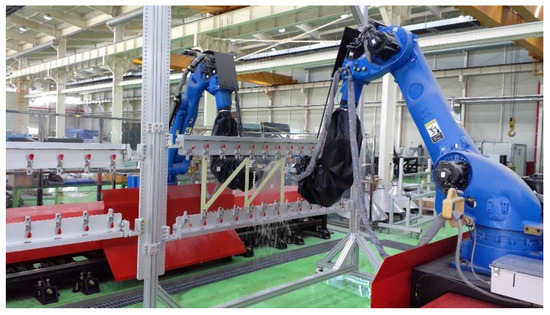 First, to examine the axis misalignment of the system intuitively, the water columns of the two robots were accurately aligned with no product to be inspected, as shown in Figure 6. Data were acquired while the robots were moved by 100 mm in the z direction and by 650 mm in the y direction, in 3 mm intervals; the data were expressed as 2D images. The frequency of the ultrasonic sensor was set to 0.5 MHz. Regarding the ultrasonic sound pressure, the linear scale was set to 50% and the log scale to 80%.