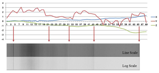 Figure 9 shows the ultrasonic image acquired in the absence of the specimen and the position coordinate values for three axes, which were measured using the laser tracker during transport of the bogie axis to identify axis misalignment. As shown in Figure 9, the ultrasonic image acquired during the transport of the bogie axis was observed to include dark and bright sections, which appear to have occurred because of the change in sound pressure caused by axis misalignment.