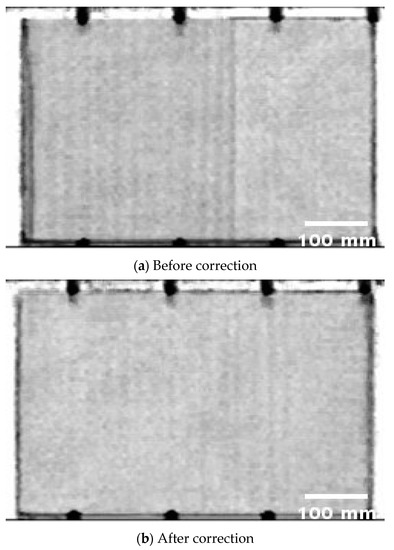The same experiment was performed with the actual composite material specimen; the results are shown in Figure 13. As with the results of the reference specimen, the majority of the changes in image contrast caused by axis misalignment were removed after correction.