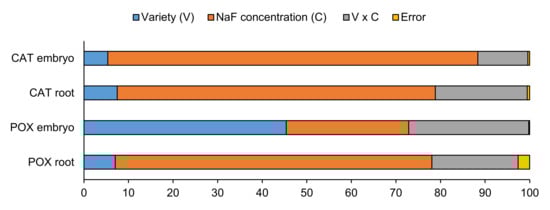 The coefficient η2 in ANOVA showed that CAT activity in the embryos and roots, as well as the activity of POX in roots, were affected to the greatest extent by concentrations of NaF, while the activities of POX in embryos were most affected by the wheat cultivar (Figure 1). It is also interesting that the contribution of the interaction between the NaF concentration and the winter wheat cultivar to the formation of CAT and POX activity was high.