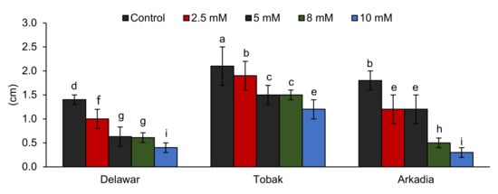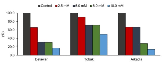 The application of sodium fluoride in all of the concentrations led to a significant decrease (p = 0.05) of root length in all cultivars, compared with the control plants. The highest total reduction of root length was for the Delawar (−73%) and Arkadia (−84%) cultivars (Figure 2). On the other hand, the reduction was at a level of 43% for the Tobak cultivar, and the root length in 10 mmol∙dm−3 of NaF was still up to 1 cm.