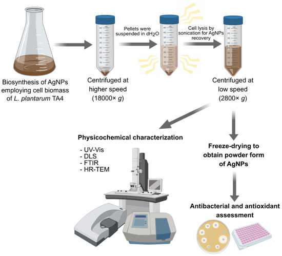 L. plantarum strain TA4 was grown overnight in the 100 mL of MRS medium and incubated at 37 °C with 150 rpm agitation. After incubation, biomass was harvested by centrifugation (2800× g for 10 min), and the supernatant was discarded. The collected biomass was washed thrice with phosphate-buffered saline (PBS), and the obtained biomass was used for the biosynthesis of AgNPs.