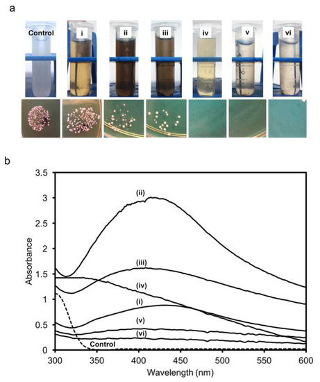 (a) Maximum tolerable concentration of L. plantarum TA4 exposed to increasing concentration of Ag+. The bacterial cell growth was determined by the spot platting technique. (b) UV–Visible absorption spectra of biosynthesized AgNPs by L. plantarum TA4 exposed with different concentrations of Ag+. (Control) AgNO3, (i) 1 mM, (ii) 2 mM, (iii) 4 mM, (iv) 6 mM, (v) 8 mM and (vi) 10 mM.