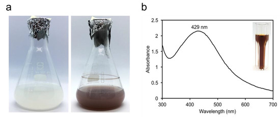 For the biosynthesis of AgNPs, the aforesaid method was performed. Similarly, the reduction of Ag+ to AgNPs was determined by visual observation correlated with color change. Figure 3a displays the reaction mixture of L. plantarum TA4 cell biomass in the Ag+ suspension (white) that turned dark brown after 24 h of incubation, suggesting the formation of AgNPs. It is well known that the color change is due to the excitation of SPR of the AgNPs. The UV–Visible absorption spectra analysis presented in Figure 3b revealed the maximum SPR excitation band of biosynthesized AgNPs centered at 429 nm, which is the typical peak obtained for AgNPs. The maximum absorption band obtained in this study is similar to the range reported in other studies [31,32].