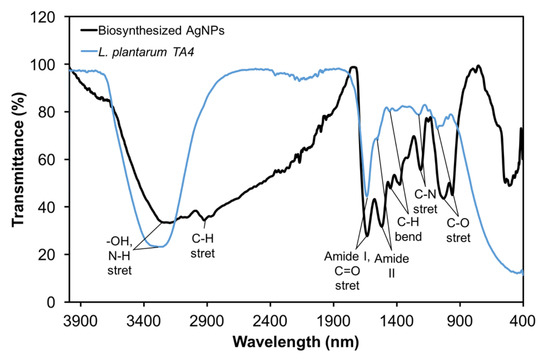 Earlier studies indicated that the fundamental mechanisms for the formation of AgNPs were facilitated by the enzyme nitrate reductase [7,39], which involved the transfer of electrons from nitrate to the metal group [40]. Likewise, Wang et al. [41] reported that the reduction of selenium nanoparticles by Proteus mirabilis YC801 occurred by cytoplasmic enzymatic reduction involving thioredoxin reductase, glutathione reductase, or NADH-related reductase. On the other hand, Sintubin et al. [11] discovered the biosynthesis of AgNPs through the interaction of Ag+ with the functional groups present on the cell membrane of several Lactobacillus species. The AgNPs were observed to be distributed on the outer layer of the bacterial cell, as visualized by TEM [11]. As a Gram-positive bacteria, Lactobacillus is composed of a thick layer of peptidoglycan, polysaccharides, teichoic acids, and proteins that provide many anionic surface groups on the cell membrane [10,42]. When the cells are exposed to Ag+, the silver cation will bind to the anionic surface, providing sites for the biosorption [11]. At this point, Ag+ interacts with proteins and other functional groups of the cell that serve as an electron donor by reducing Ag+ to its respective metal atom (Ag0) and subsequently developing AgNPs. Moreover, proteins may also bind to AgNPs through free amino or carboxyl groups, which serve as capping agents [43]. Therefore, it can be postulated that biomolecules and functional groups present in bacterial cells or secreted by the bacteria serve as the reducing agents and promote the production of AgNPs. To sum up, the cell biomass of L. plantarum TA4 has demonstrated the potential as a nanofactory for the development of AgNPs without the use of harsh chemicals and high energy consumption. Subsequently, the formation of AgNPs was validated by FTIR analysis to determine the functional groups involved in the synthesis process.