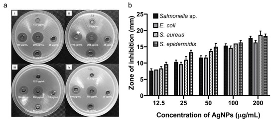 The antibacterial activity of biosynthesized AgNPs was carried out using the agar well diffusion method (Figure 7a) against Gram-positive (S. aureus and S. epidermidis) and Gram-negative (E. coli and Salmonella sp.) pathogens employing various concentrations of AgNPs (12.5, 25, 50, 100, and 200 µg/mL). Figure 7b depicts the increased inhibition zone associated with the increase of AgNPs concentration, which may be due to more Ag+ being released at a higher concentration. It was found that the inhibitory effects of AgNPs against all tested pathogens were similar. Previous studies reported that the inhibitory effect of AgNPs was more pronounced on Gram-negative bacteria compared to Gram-positive bacteria due to the thickness of the cell wall and cell composition [50,51].