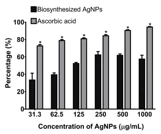 Antioxidant activity of biosynthesized AgNPs. Ascorbic acid was used as a positive control. Each value represents the mean ± SD of three replicates. * p < 0.05.