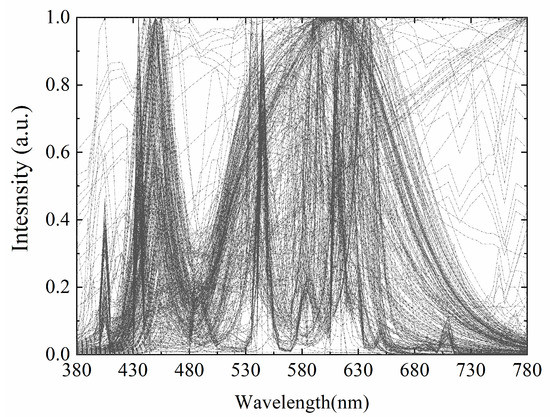 To test the circadian effect and mesopic efficiency under a dim road lighting environment, we calculated the CCT, S/P ratio, EML, CLA, and CS of a large set light source and analyzed their relationships. We adopted the light source data from IES TM30-15 for 318 light sources [43], as shown in Figure 1, including all kinds of light sources, such as incandescent lamps, fluorescent lamps, high-pressure intensity discharge lamps, and LEDs, to assess EML, CLA, and CS in mesopic and near photopic vision. We set the photopic adaptation illuminance levels at 1, 3, 10, 30, and 100 lx. These illuminance levels are equal to 0.1, 0.3, 1, 3, and 10 cd/m2 for asphalt or concrete roads with a reflectance rate equal to 0.3, covering both mesopic and near photopic vision luminance ranges. In the assessment of the melanopic effect, retinal illuminance is required. For simplicity, we assume that retinal illuminance is equal to mesopic illuminance in mesopic vision and photopic adaptation illuminance in photopic vision.