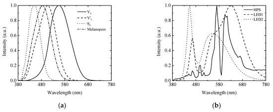 Figure 2a shows the spectral sensitivity curve of the photopic vision Vλ, scotopic vision V’λ, S-con fundamental Sλ, and melanopsin corrected with the lens, which are used in the calculations. We further adopt typical road lighting sources, an HPS light source, and a low CCT phosphor-converted (PC) LED and high CCT PC LED, as shown in Figure 2b, to test their circadian and mesopic performance.