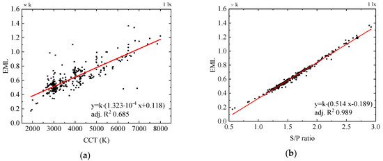 (a) Equivalent melanopic lux (EML) plot against correlated color temperature (CCT) at an illuminance value of 1 lx. In the graph, x represents CCT, y represents EML, and k is the adjusting coefficient equal to the illuminance level, e.g., 1 at a 1 lx level. (b) EML plot against the S/P ratio at an illuminance of 1 lx.