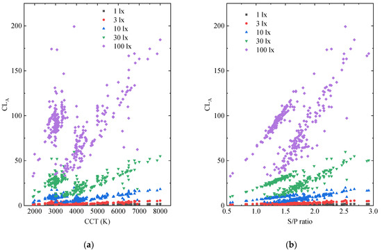 Circadian light (CLA) plot against the (a) CCT and (b) S/P ratio.