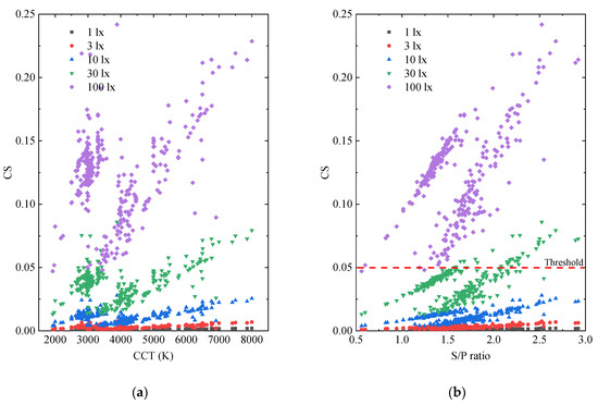 Circadian stimulus (CS) plot against the (a) CCT and (b) S/P ratio.