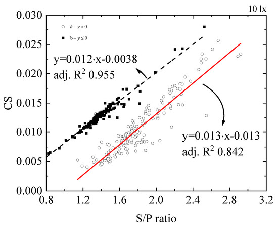 Because CLA and CS are piecewise functions, there are no significant correlations between the CLA (or CS) and S/P ratio using the Spearman correlation test. We categorized these points into two groups according to their b–y relation. For example, at a 10 lx illuminance level, there is a high goodness-of-fit between the CS and S/P ratio of 0.955 for b–y < 0 and 0.842 for b–y > 0, as shown in Figure 7. However, in actual applications, this conclusion might be impractical due to the trouble of declaring the b–y value.