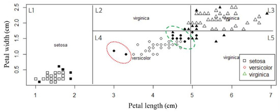 The construction of a decision tree and SVMs for the iris data shows the boundaries and support vectors (the filled shapes). The support vectors in the regions are located far away from the majority-class centroid.