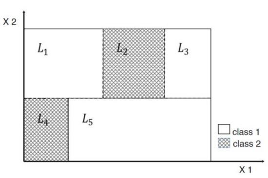Besides, for large-scale SVM problems, a joint approach that combines SVM with other machine learning methods has emerged. Many evolutionary algorithms have been proposed to select training data for SVMs [19,20,21,22]. Although they have shown promising results, these methods need to be executed multiple times to decide proper parameters and training data, which is computationally expensive. Decision tree methods also have been commonly proposed to reduce training data because the training time is proportional to where represents discrete input variables [23] so is faster than traditional SVMs. The decision tree method recursively decomposes the input data set into binary subsets through independent variables when the splitting condition is met. In supervised learning, decision trees, bringing forth random forests, are one of the most popular models because they are easy to interpret and computationally inexpensive. Indeed, taking advantage of decision trees, several researches combining SVMs with decision trees have been proposed for large-size SVM problems. Fu Chang et al. [24] presented a method that uses a binary tree to decompose an input data space into several regions and trains an SVM classifier on each of the decomposed regions. Another method using decision trees and Fisher’s linear discriminant was also proposed for large-size SVM problems in which they applied Fisher’s linear discriminant to detect ‘good’ data samples near the support vectors [25]. Cervantes et al. [26] also utilized a decision tree to select candidate support vectors using the support vectors annotated by SVM trained by a small portion of training data. Their approaches, however, are limited in that it cannot properly handle the regions that have nonlinear relationships.