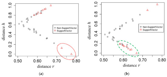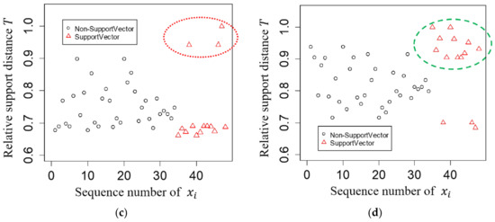 The relationship between support vectors and distances and is illustrated in Figure 4. We use leaves with distinct adjacent regions and in Figure 1. In Figure 4, the observations marked by circles are non-support vectors while those by triangles (in red) are support vectors selected after training all data by SVMs. The distances and of relative to are in Figure 4a, and the relative support distance measures in Figure 4c. Likewise, those of L4 relative to L2 are in Figure 4b,d. We observe that the observations, marked by triangles and surrounded by a red ellipsoid in Figure 1, correspond to the support vectors surrounded by a red ellipsoid in region in Figure 4a, and they have larger values of relative support distance as shown in Figure 4c. Similarly, we notice that the observations, marked by triangles and surrounded by a green ellipsoid in Figure 4b, correspond to the support vectors surrounded by a green ellipsoid in region in Figure 1, and they also have larger values of relative support distance as shown in Figure 4d. The support vectors in are obtained by collecting observations with large values of relative support distance, for example by the rule , from both the pair of and and the pair of and . The results reveal that the observations that have a mostly larger distance and shorter distance are likely to be support vectors.