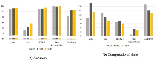 We compare the performance of , , , and in terms of classification accuracy and the training time (in seconds), summarized in Table 4. We also depicted the performance comparison of the proposed with and on the five largest datasets when in Figure 5. We used log-2 scale for y-axis in Figure 5b. In Table 4, Acc is the accuracy on test data; is the standard deviation; and Time is the training time in seconds. Even though the accuracy of the proposed algorithm is slightly degraded in a few cases, it is higher than that of and in most cases. In addition, as is greater, the accuracy of the proposed algorithm enhanced substantially. For small datasets, there is no significant improvement on computation time compared to the standard SVM since those datasets are already small enough. However, we notice that the training time of improved quite much when using the large-scale datasets.