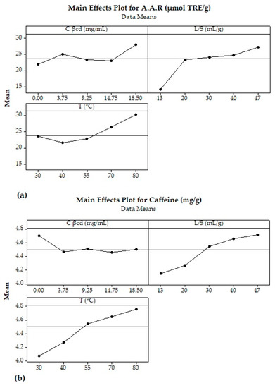 Main effects plots presenting the effect of β-cyclodextrin concentration (Cβcd, mg/mL), liquid-to-solid ratio (L/S, mL/g), and temperature (T, °C) (a) on extract antiradical activity (AAR, μmol TRE/g) and (b) on caffeine extraction yield (CCaf).