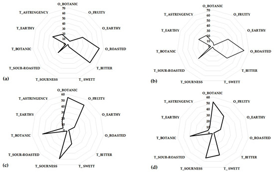 Spider graph for the sensory attributes of the different brews. (a) AQC: aqueous extract from coffee seeds, (b) AQC/CD: β-cyclodextrin extract from coffee seeds, (c) AQCW: aqueous extract from coffee pulp, (d) AQCW/CD: β-cyclodextrin extract from coffee pulp.