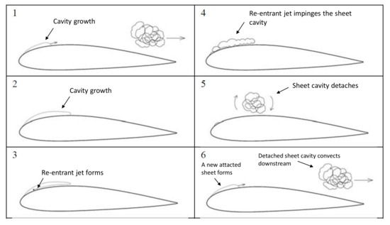 Even in the case of steady uniform inflow conditions, we can observe unsteady behavior of the cavitation. In particular, the shedding behavior of sheet cavitation (Figure 1) and its subsequent transformation to cloudy and bubbly cavities are important in the generation of the aforementioned erosion and noise issues, since upon collapsing these cavitation types can yield strong pressure fluctuations and even shock waves in the bubbly mixture or in the liquid phase [1,2]. A sketch of the shedding cycle of two-dimensional sheet cavitation is shown in Figure 1. The first frames depict the growth of the attached sheet cavity following the break-off of the previous sheet. The growth will cease after a certain length of the sheet cavity, and a strong re-entrant jet is formed at the closure of the sheet cavity, as depicted in Frame 3. The following frame shows the impingement of the cavity interface by the jet, as the jet reaches the cavity near the leading edge. The rear part of the sheet cavity breaks off and reduces to a bubble cloud, which is convected downstream as shown in Frame 5. As the cloud travels downstream, parts of it may undergo a violent collapsing stage, possibly causing noise and material erosion. Meanwhile, as seen in Frame 6, the newly formed sheet cavity on the foil behind the LE will begin to grow, initiating a subsequent break-off cycle.