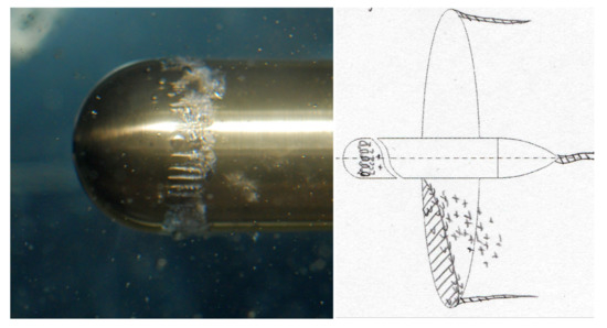 Cavitation extent observed in the experiments with and . Left picture shows a photograph of the head of the cavitator in the experiments, and right picture shows a sketch of the mean cavitation extent on the cavitator. The pictures are reproduced with permission from Rhena Klose (SVA).