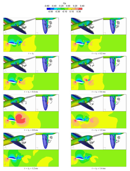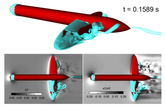 In Figure 17 we show a set of snapshots for a stage of the shedding cycle at which the cavity undergoes a rapid collapsing stage, and the associated instantaneous pressure distributions. The figure shows the case with the lower cavitation number, . The cavity cloud has shed off at , and we observe an increase in pressure on the plane at mid-span, just below the cavity. As the collapse stage advances, the pressure values grow larger, and the pressure front starts to propagate in all directions quite rapidly. We note very high values for the due to the major collapse events ms. The maximum value recorded for the investigated plane was ≈3. After this, the pressure wave front grows and intensifies, and then also quickly dissipates. Next, we are left with small regions of negative pressure in the place of the shed cavity clouds at the two latest investigated time instants. Looking at the cavitator body, the pressure wave due to the major collapse at ms reaches it a few tenths of ms later. The cavitator body on the upstream side of the wing shows areas of increased positive pressure, and the downstream side of it in turn has a momentarily lower negative pressure. At the moment of the collapse event, also high pressures are recorded on the suction side of the wing near the trailing edge, as the cavity collapses just above it, at the same time the pressure side of the wing is masked from this effect. The dynamics of the bulk cavitation on the wing, then again, appears to be unaffected by the pressure waves that result from the cavity collapse. The attached sheet cavitation continues to grow on to enter the shedding phase described in Section 4.3.3. Also, at subsequent time instants, the shed-off cavity continues to form the cavitating ring vortex. We assess this further in Section 4.5. The cavitating vortex due to the hub of the cavitator body also appears to be not affected by the collapse event.