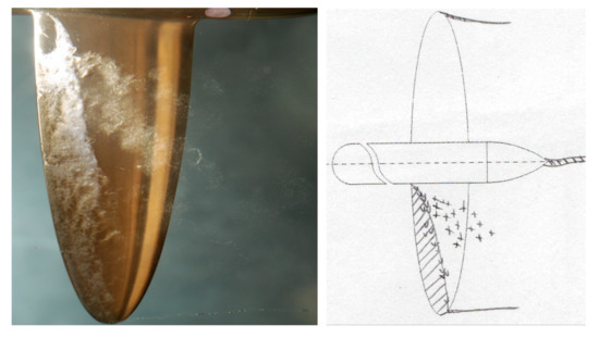 Cavitation extent observed in the experiments with and . Left picture shows a photograph of the right foil of the cavitator in the experiments, and right picture shows a sketch of the mean cavitation extent on the cavitator. The pictures are reproduced with permission from Rhena Klose (SVA).