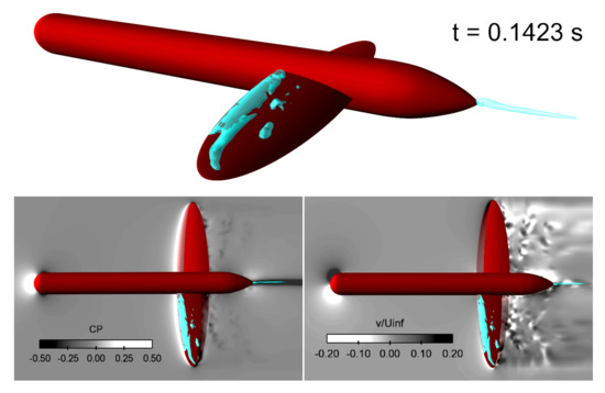 A sequence of snapshots visualizing a collapse event of the cavity. DDES with medium grid, . Top frames show the left wing from the side and the top, and the bottom frame shows a cut plane at mid-span. The cavitator and the cut plane are colored by .
