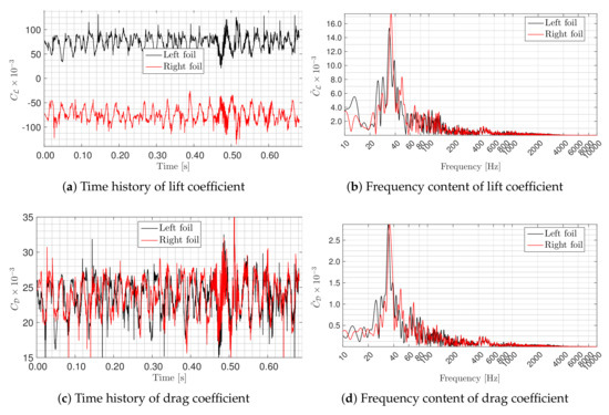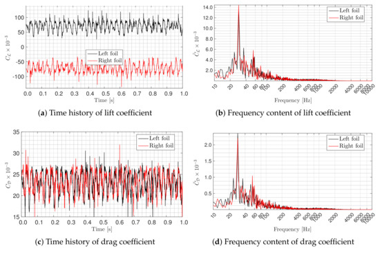 We observed a dominant frequency of around 30 Hz for the case with and . We show an example of the time histories and corresponding frequency contents in Figure 10 obtained from DDES, and in Figure 11 obtained from the SST simulations. A frequency of 29.0 Hz for both the lift and drag coefficients was seen with coarse and medium grids when using the SST model. A dominant frequency of 29.0 Hz was observed with coarse grid DDES for both the lift and drag coefficients, while a dominant frequency of 33.4 Hz was observed for lift and 35.0 Hz was observed for the drag with medium grid DDES. Animations from fine and medium grid DDES and SST simulations revealed a frequency of approximately 30 Hz for the sheet-cavitation shedding. Comparing the DDES and SST simulations, we see that the shedding frequency increases slightly with DDES on the medium grid. The time histories of the SST simulations appear slightly more regular, which is seen also as the sharper frequency peaks whereas these are more spread when using DDES. If we approximate the reference length of the Strouhal number as the chord length, the Strouhal numbers’ range is . If we instead take the reference velocity as , the Strouhal numbers would range as .