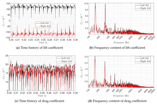 There was a small deviation between the mean lift coefficients of the left and right foils with the same cavitation number, while the mean drag coefficients were the same for both foils on each grid. We noted small differences also in the frequencies exhibited in the time histories. A decrease of approximately 40% of the mean lift and an increase of approximately 40% of the mean drag are seen in the results with compared to the results of . This is because there is considerably more suction side sheet cavitation for the case with , since the cavitation number is lower. The increase in the amount of the vapor phase on the suction side in turn decreased the lift and increased the drag of the foil. This difference was visible in the results using each of the three different grid densities.
