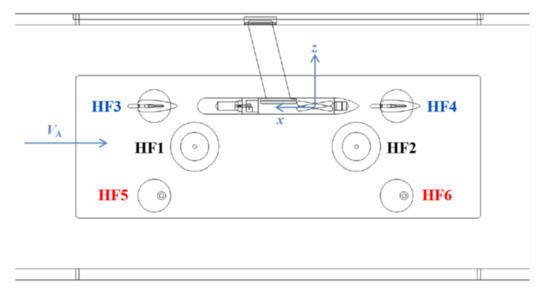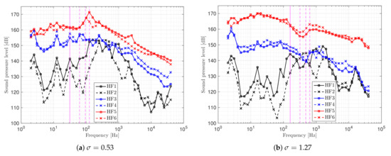 Figure 14 shows the results of the conducted hydrophone measurements. In the figures, we show six different hydrophone arrangements. HF1 and HF2 denote the hydrophones in an acoustic chamber, with HF1 mounted in the wall of the cavitation tunnel at a distance of 0.500 m from the origin of the cavitator (see Figure 13), and HF2 mounted a distance of 0.414 m from the cavitator. HF3 and HF4 are located longitudinally to the flow, and the distances to the cavitator are 0.543 m for HF3 m and 0.352 m for HF4. HF5 and HF6 are located transversally to the flow, and the distances to the cavitator are 0.522 m for HF5 m and 0.420 m for HF6. The sensors HF1, HF3 and HF5 are located upstream of the cavitator, and the sensors HF2, HF4 and HF6 are located downstream of the cavitator.