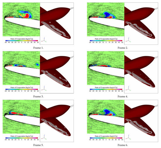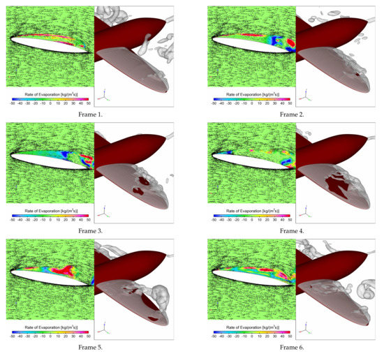 Similarly as above, the first frame of Figure 16 (case ) depicts the initial stages the attached sheet cavity growth. Cavity clouds are shed in the wake of the foil, and an attached sheet cavity begins to grow from the leading edge of the foil. There is strong evaporation in the layers close to the wall of the sheet cavity, and condensation takes place on the closure of the forming cavity. A detached cavity cloud is convected to the slipstream and vortical flow is associated with it. In frames 2–3, the attached sheet cavitation grows in length along the foil. In Frame 2, we observe evaporation at the center of the attached cavity cloud, whereas condensation takes place around the closure of the sheet cavity. As we reach Frame 3 a re-entrant jet is visible. The jet draws the liquid phase toward the LE, underneath the sheet cavity and splits the evaporation zone of the previous frame in two parts. Frame 4 depicts a partial break-off stage as the re-entrant jet begins to impinge the sheet cavity. Condensation now takes place both in the LE and the TE of the detaching cavity, although evaporation is present at its core. A tiny cavity at the LE of the foil begins to form. Once we reach Frame 5, the impingement of the re-entrant jet is more complete, and we observe that the sheet cavity has broken off on a wide span. The cavity cloud starts to rise away from the foil to be convected by the external flow. Stronger vortical flow forms around the core of the detached cavity. In Frame 6 we observe this cavity cloud being convected farther in the wake, as a new shedding cycle is about to begin. We furthermore observe condensation beginning to dominate over evaporation in the detached cavity. A strong recirculating flow is visible around the detached cavity cloud. Again, the flow is three-dimensional over the span of the foil, and the break-off does not occur simultaneously over the span.