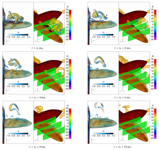 In Figure 18 we demonstrate the formation of a cavitating ring vortex. The figure depicts six snapshots at 2 ms intervals of the DDES on a medium grid with and . On the left side of each frame, the isosurfaces of and Q = 40,000 are shown. Moreover, the Q-criterion is colored by helicity . The helicity denotes the cosine of the angle between the velocity and the vorticity vectors, and tends to in the cores of free vortices, the sign indicating the direction of swirl. On the right side of each frame, three cut planes are shown at spans of , which are colored by the rate of evaporation . Also, on the right side of each frame, the iso-surface of is shown as the transparent orange surface. At the beginning of this series of snapshots (), we are approaching the end of a shedding cycle (cf. Figure 15) with cavitation and vortical flow structures being shed in the wake of the foil. A complex interaction with the shedding vapor clouds and liquid-phase flow introduce vast vortical flow structures when the sheet cavity detachment takes place between and . As separate and partially cavitating vortex filaments convect downstream, some of these join together to form a ring-shaped structure, or a toroidal-type vortex between and . Observing the helicity of these toroids, we note that once it is a true vortex ring or even a piece of such, the vorticity is strong enough for the flow inside these rings to cavitate in most parts clearer and at a higher intensity. Once these structures convect farther downstream (), dissipation owing to the coarsening grid in the wake diminishes the strength of the toroid-like shape, leading to dissipation of the cavitation as well, despite the used compressive flux limiter. Moreover, as was mentioned above, we observe the strongly three-dimensional cavitation structure in Figure 18. For instance, the rates of evaporation on the three cut planes are vastly different from each other, albeit the sheet cavitation covering the entire foil superficially appears as rather steady at several time instants. Also chord- and spanwise fluctuations can be observed on the iso-surface of the Q-criterion.