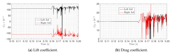 A peculiar modelling issue regarding the cavitation dynamics was observed during the simulations. The case with was initially begun with the SST model, but the predicted suction side sheet cavitation remained stable throughout the simulations. We observed no natural shedding of the sheet cavitation, and the time histories of the global forces were flat. We carried out the simulations with the SST model until , after which the DDES approach was activated. The outcome is illustrated in Figure 19 in terms of the time histories of the lift and drag coefficients. It was observed that almost immediately after the DDES approach was activated, the suction side sheet cavitation began its shedding behavior, leading to high-frequency oscillations also in the global force coefficients.