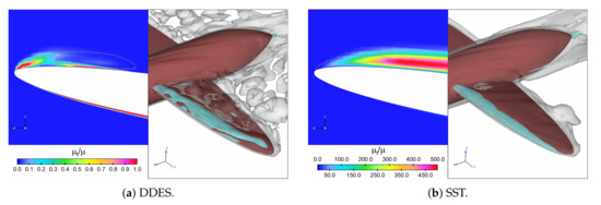 A comparison of the DDES and the SST simulation is shown in Figure 20, made from visualizations of the eddy-viscosity levels near the LE of the foil on a cut plane at mid-span, cavitation extents and vortical flow structures. We observe a significant difference in the eddy-viscosity distributions. The SST simulation predicts several orders of magnitude larger eddy-viscosity levels on the suction side of the foil. This not only suppresses any vortical structures around the foil, but also prevents the natural shedding mechanisms of the sheet cavitation to take place. Instead, the predicted suction side cavitation remained stable as consequently did the lift and drag forces as well, as we noted in Figure 19. By contrast, when using DDES, similar levels of eddy-viscosity are not predicted by the model at the closure of the sheet cavity. We also note considerably more unsteady vortical flow structures with DDES, shed in the wake of the foil. Due to these reasons, the natural shedding of the sheet cavity did occur as was demonstrated in Section 4.2 and Section 4.3.