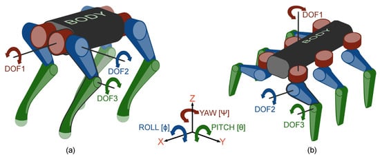Hexapod template models such as AMOS [] and MORF [] often have similar kinematics, e.g., placement of motors, identical legs and leg joints that are angled to move the leg either vertically or horizontally (Figure 1b). Having joint angles aligned with the yaw, roll, or pitch axes can simplify the development of the controller, as well as lessen the torque on the motor for the first degree-of-freedom (DOF1) during locomotion (Figure 1b), which is quite different from insect morphologies, where the movement of one joint will influence the limb in all axes [].