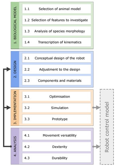 Developing walking robots has numerous challenges, as design parameters can be inversely related, and require detailed optimisation and a wide network of suppliers for the hardware []. For example, the design needs to be mechanically robust while having minimal mass, and the components need to be compactly assembled while the leg movement should not be restricted. The framework for developing bio-inspired morphologies (Figure 3) provides a guide to handling these challenges. The framework also enables the robot controller to be developed in parallel with the hardware.