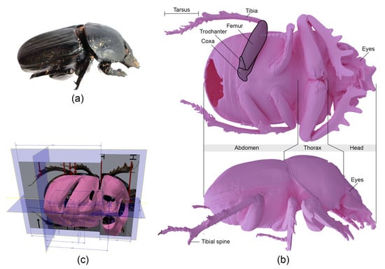 Precise three-dimensional measurements of the dung beetle are needed to guide the development of the robot. For this, dead specimens stored in the ethanol of S. galenus (Figure 4a) from South Africa were used. Their weight and body length were measured. Then, approximately 2 mm of the distal tip of the abdomen (Figure 4b) was cut off to let the internal tissue of the specimen air-dry, which increased both the contrast and visibility of the exoskeleton in the CT scans.