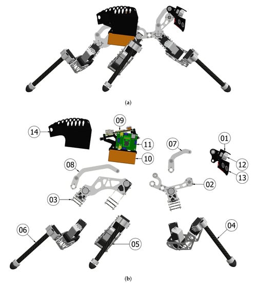 - Roennau, A.; Heppner, G.; Pfotzer, L.; Dillmann, R. Lauron V: Optimized leg configuration for the design of a bio-inspired walking robot. In Nature-Inspired Mobile Robotics; World Scientific: Singapore, 2013; pp. 563–570. [Google Scholar] [CrossRef]